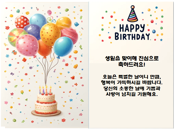 | 2 | 생일을 맞이해 진심으로 축하드려요! 올해도 당신의 모든 소원이 이루어지길 간절히 바랍니다. 행복과 기쁨이 넘치는 하루 보내시고, 앞으로의 날들도 항상 빛나길 바라요. |