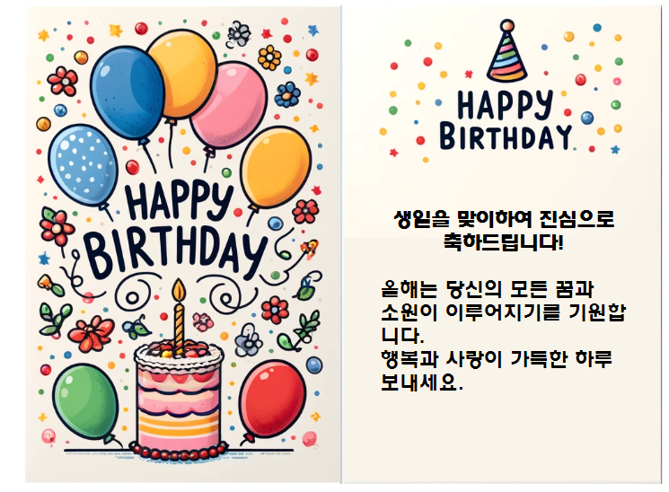 | 8 | 생일을 맞이하여 진심으로 축하드립니다! 항상 행복하고 건강하시길 바랍니다. 당신의 특별한 날에 기쁨과 사랑이 가득하길 기원해요. |