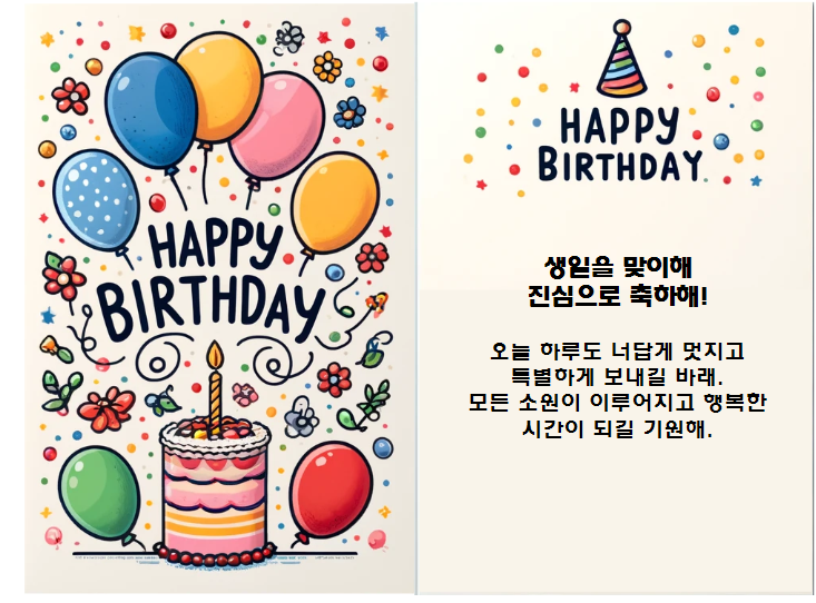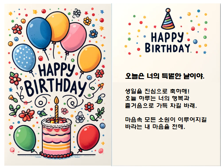 | 14 | 생일을 맞이해 진심으로 축하해! 모든 일이 잘 풀리고, 기쁨과 행복이 가득한 하루가 되기를 바래. 너의 모든 소원이 이루어지길 기원해. |