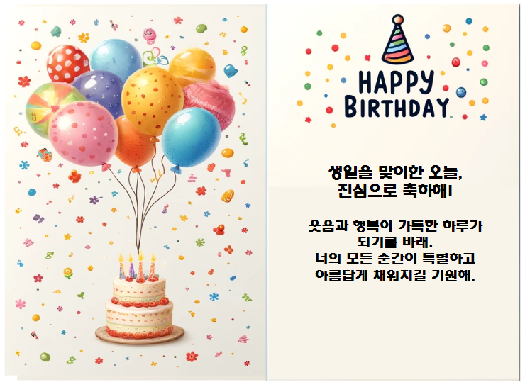 | 13 | 생일을 맞이해 진심으로 축하해! 오늘 하루는 특별하고 즐거운 시간이 되길 바래. 너의 모든 소원이 이루어지기를 기원해. |