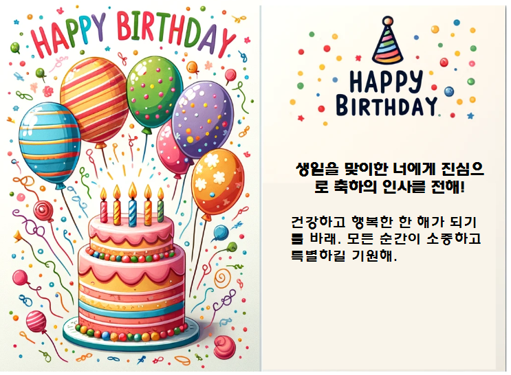| 5 | 생일을 맞이한 너에게 진심으로 축하의 인사를 전해! 건강하고 행복한 한 해가 되기를 바래. 모든 순간이 소중하고 특별하길 기원해. |
