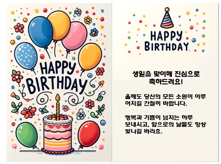 이렇게 당신에게 생일 축하의 마음을 전할 수 있어 정말 기쁩니다. 당신의 특별한 날이 기쁨과 사랑으로 가득하길 바랍니다. 생일을 맞아 당신의 모든 소원이 이루어지길 진심으로 바랍니다. 행복하고 건강한 한 해 되세요. 생일 축하해요!