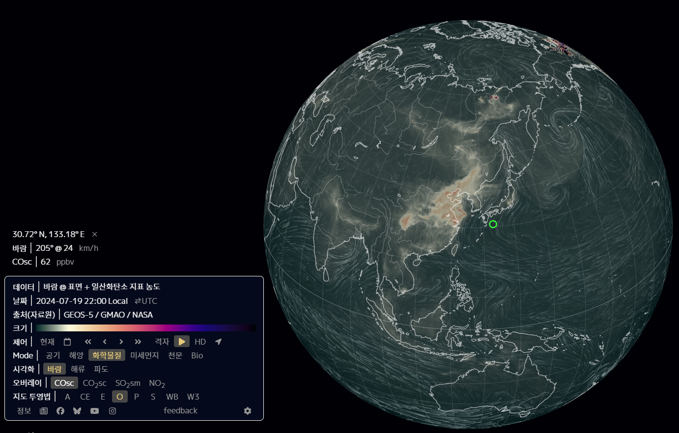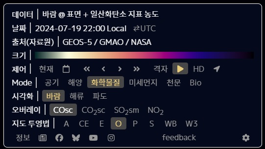Earth Nullschool에서 바람과 화학물질 데이터(특히 COsc, CO₂sc, SO₂sm, NO₂) 오버레이를 통해 인지할 수 있는 주요 정보는 다음과 같습니다.