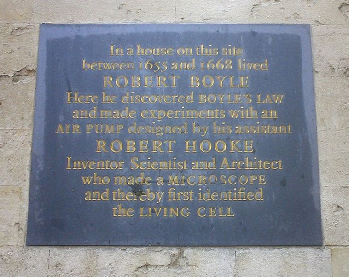 로버트 보일과 로버트 후크를 기리는 기념 명판(F): 보일이 1655년과 1668년 사이에 이 장소에 살았음을 기념하며, 보일의 법칙(Boyle's Law)을 발견하고, 그의 조수인 로버트 후크가 설계한 공기 펌프를 사용하여 실험을 수행하였다는 내용. 옥스퍼드 하이 스트리트의 셸리 기념관 외부에 위치