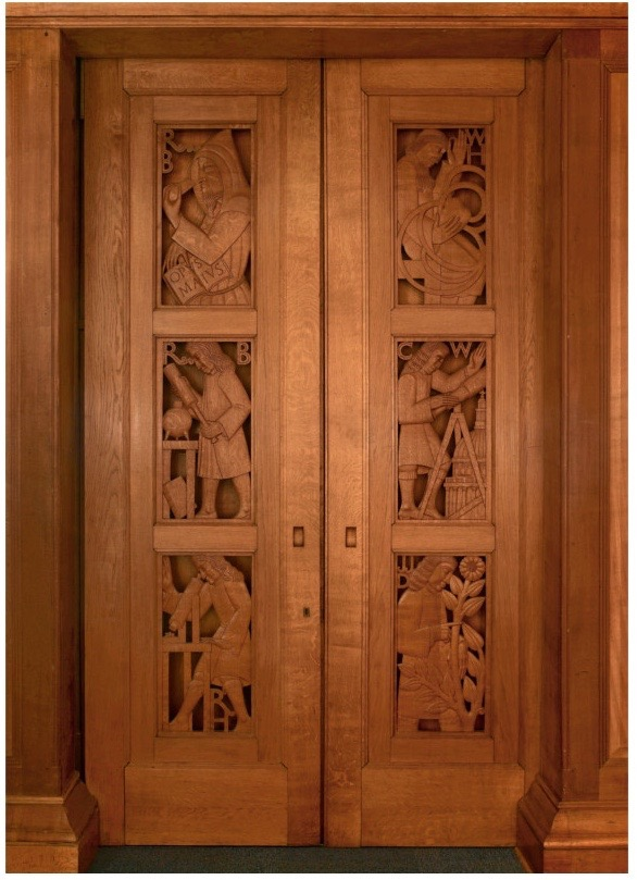 Gill Door(E): 옥스퍼드 대학교의 Radcliffe Science Library로 이어지는 조각된 나무 문(1935). 왼쪽 패널 제일 하단.
