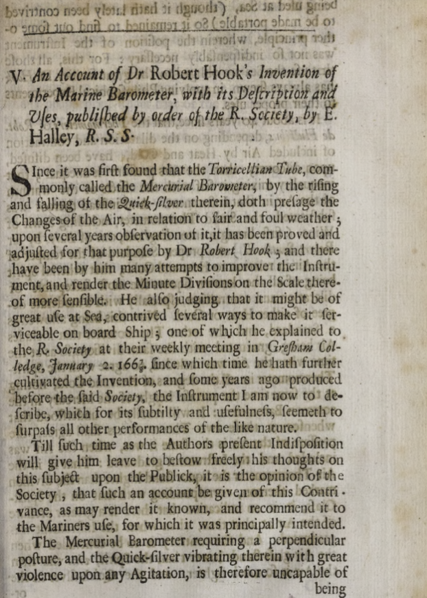 | 1663 | 1663년에 크리스토퍼 렌 경은 기상 조건을 자동으로 기록하는 기상 시계를 설계했습니다. 후크는 렌과 협력하여 압력, 온도, 강수량, 습도, 풍속 및 풍향을 회전 드럼의 표시로 기록하는 충격 망치를 사용한 첫 번째 작업 모델을 만들었습니다. ※ Derham, DW Robert Hooke 박사의 철학적 실험 및 기타 관찰 Orig. 로이. Soc., London, (1724) 41페이지. |