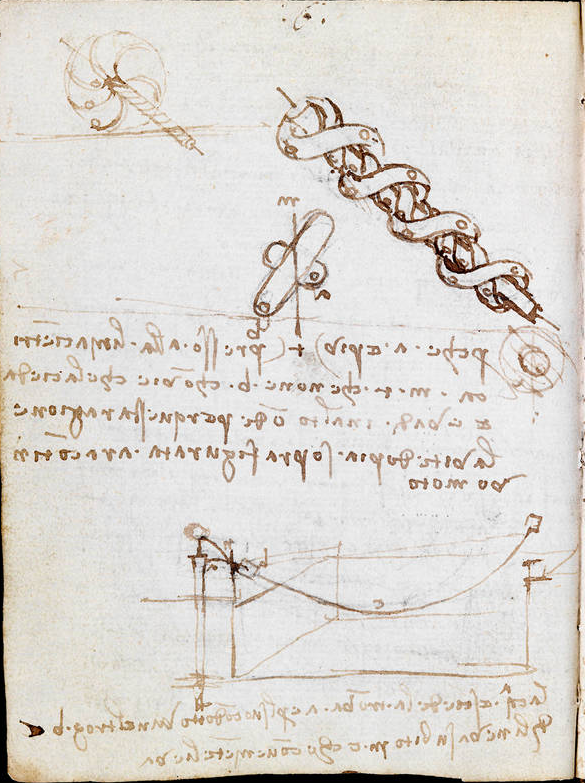 ▷ 영구운동 장치: 영구 운동은 한 번 활성화되면 영원히 돌아가는 바퀴처럼 영원히 돌아가는 가상의 기계 개념입니다. 레오나르도는 영구 운동에 대한 철저한 연구를 여러 번 했지만 결국 이 이론을 거부했습니다. 출처는 빅토리아 앤 앨버트 박물관입니다. 이 사이트를 통해 레오나르도의 Codex Forster I, II, III의 광범위한 내용을 읽을 수 있습니다.