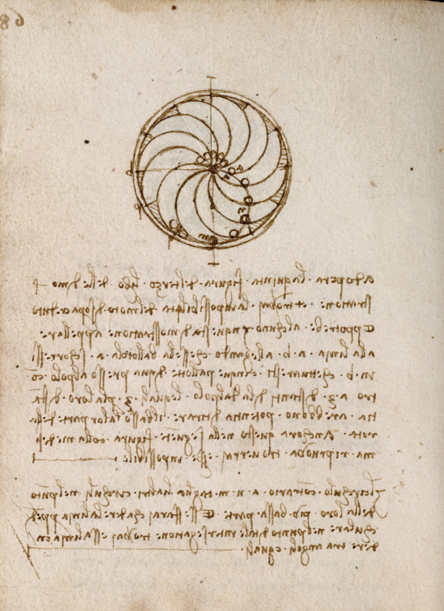 - 거울 쓰기: 레오나르도의 글은 거울 쓰기 형태로 작성되었습니다. 이는 오른쪽에서 왼쪽으로 글을 쓰는 방식으로, 개별 문자가 반전되어 있어 거울로만 읽을 수 있습니다. 이는 그의 작업을 보호하기 위한 조치로 여겨집니다.