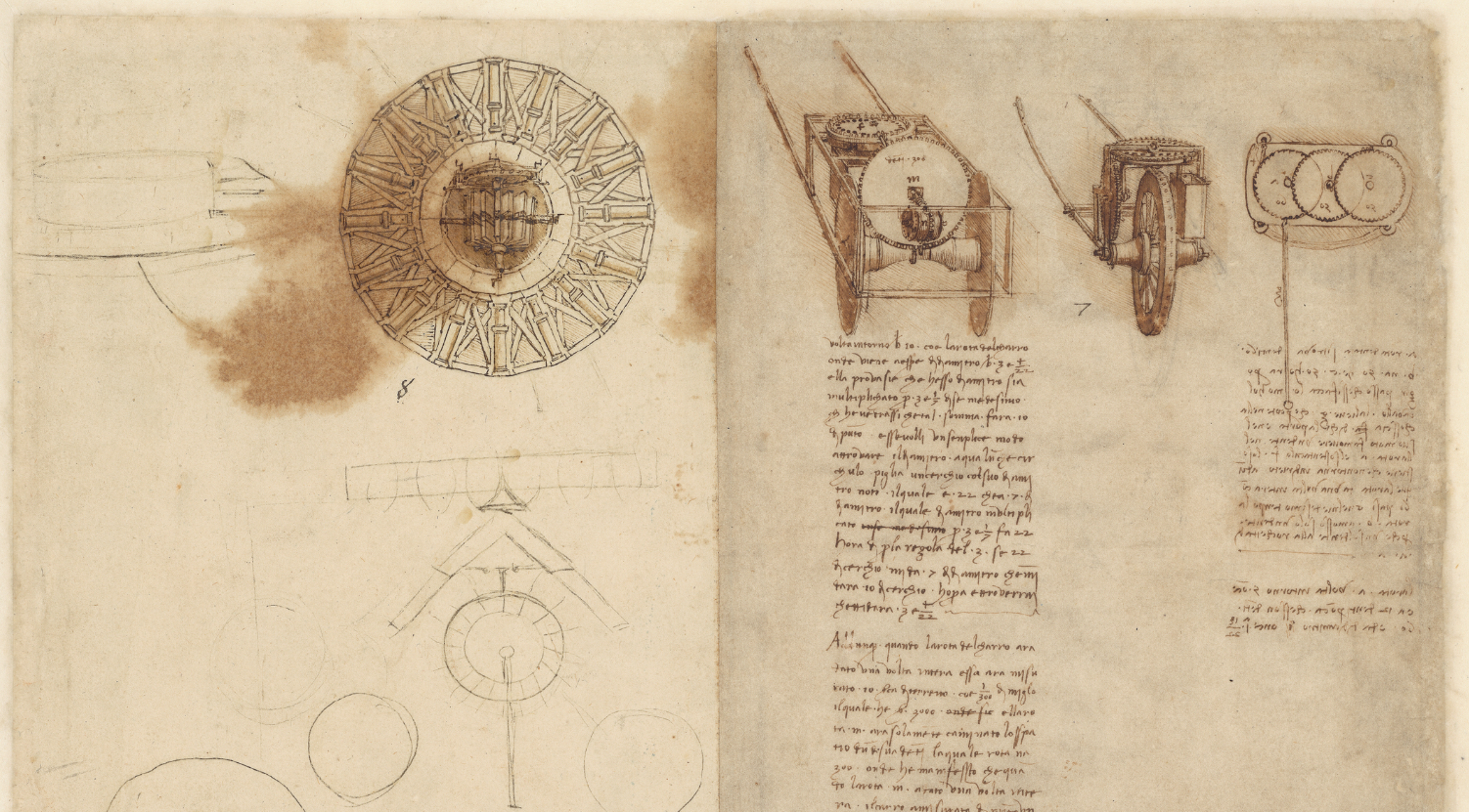 ▷ 중앙 하단의 스케치: 다양한 기계 부품의 세부적인 구조와 그 작동 방식을 보여주는 추가적인 스케치들로, 레오나르도의 기계적 사고가 어떻게 발전했는지를 잘 보여줍니다.