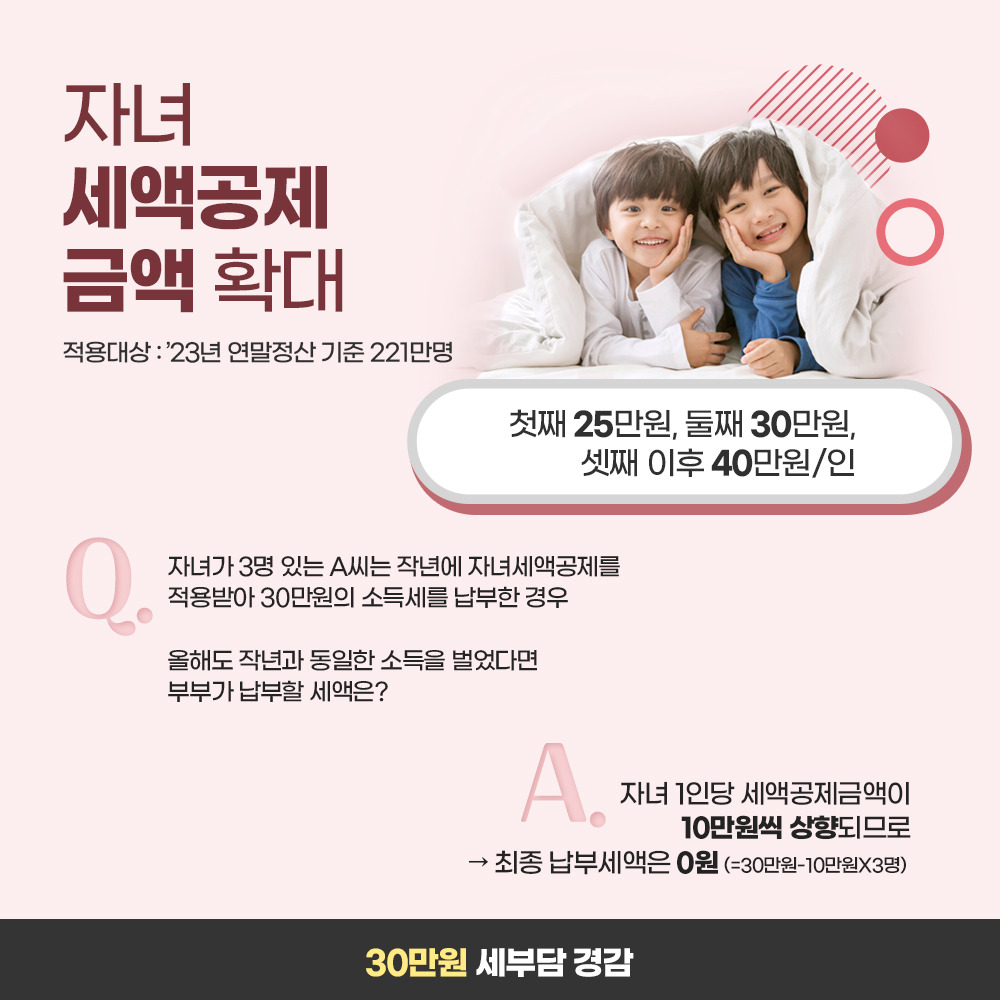 2️⃣ 상속세 자녀공제 확대: 자녀 1인당 공제액이 5천만 원에서 5억 원으로 대폭 증가합니다.
