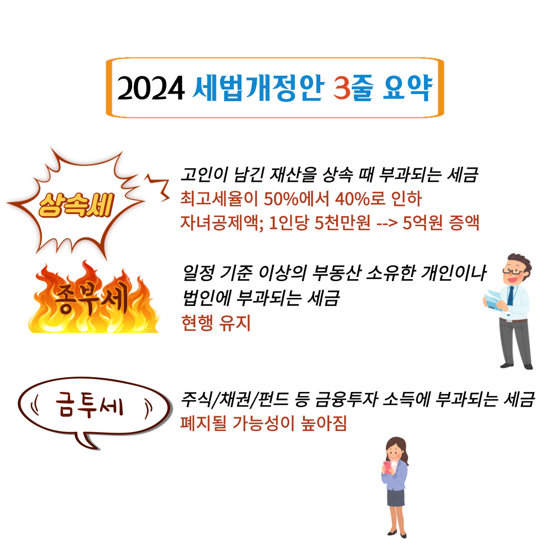 지난 7월 25일 2024년 세법개정안이 발표됐다. 말 그대로 개정안이다. 최종적으로 국회 통과가 어떻게 될지 지켜봐야 한다. 상속세 최고세율 인하, 종부세 유지, 금투세 폐지 등 중요한 변화가 예고되었습니다. 이번 포스트에서 이러한 변화들이 우리 생활에 어떤 영향을 미칠지 자세히 알아보겠습니다.