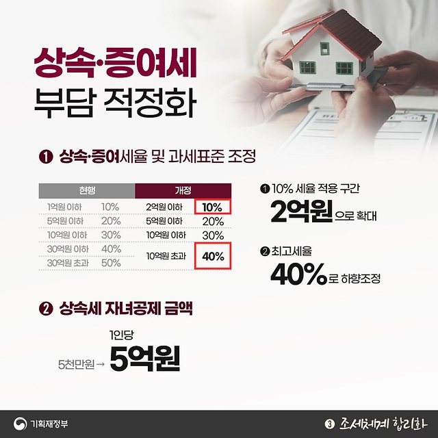 1️⃣ 상속세 최고세율 인하: 50%에서 40%로 인하되며, 2억 원 이하의 재산에 대해서는 10%의 상속세가 적용됩니다.