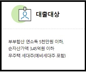 | 소득 | 대출신청인과 배우자의 합산 총소득이 5천만 원 이하. 특정 조건에 따라 최대 7.5천만 원 이하. |