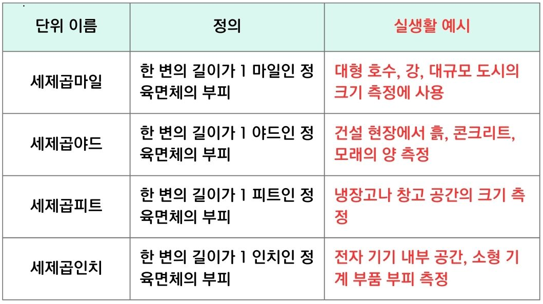 ♣ 세제곱피트(ft³)와 세제곱야드(yd³)는 건축, 무역, 농업에서 사용되기 시작했으며, 특히 건설 현장에서 건축 자재의 양을 측정하는 데 필수적인 단위가 되었습니다.