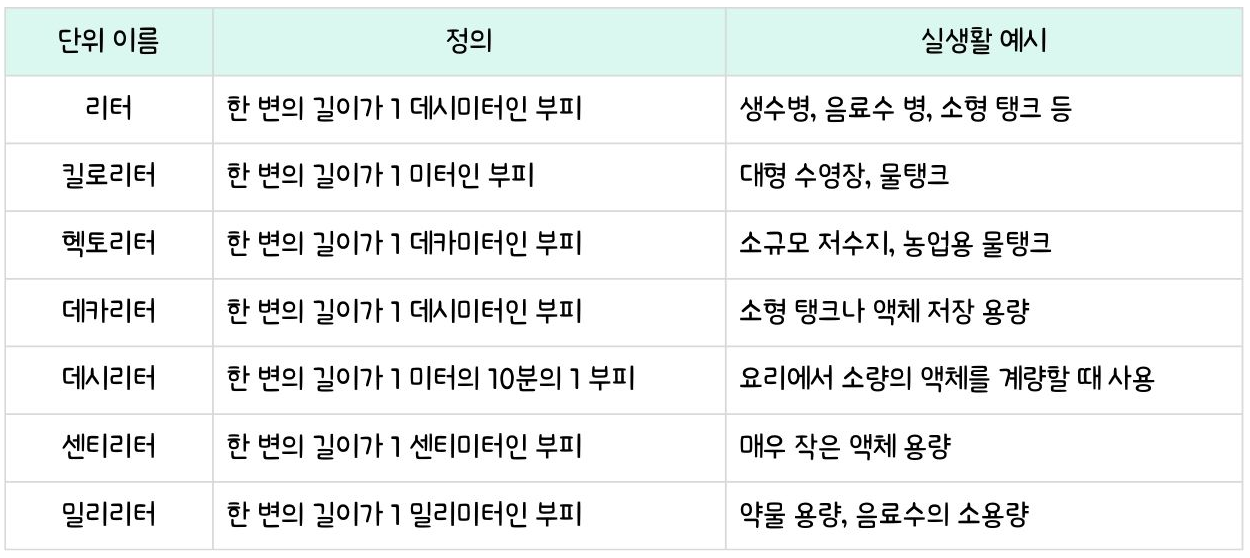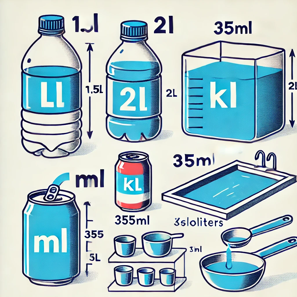 ♣ 리터(L): 1L는 약 1,000mL로, 일상에서 가장 많이 사용하는 단위입니다. 일반적인 생수병의 용량은 1.5L 또는 2L입니다.