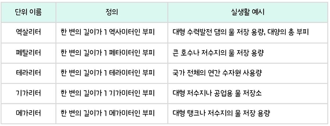 ♣ 테라리터(TL): 국가적 규모의 수자원 사용량을 나타낼 때 주로 사용되며, 대형 댐에서 저장되는 물의 양이나 대규모 공업용수의 사용량을 측정하는 데 사용됩니다.