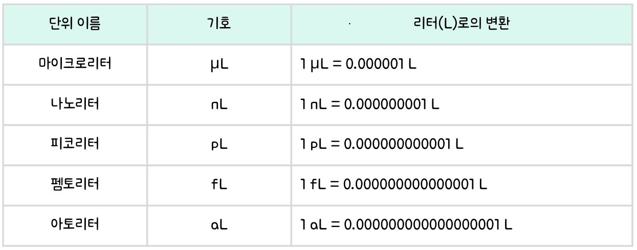 ♣ 펨토리터(fL): 주로 세포 분석과 같은 생명과학 연구에서 사용됩니다. 세포 한 개의 부피를 펨토리터 단위로 측정할 수 있습니다.