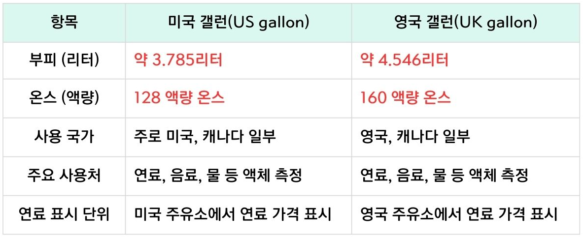 아래는 미국 갤런(US gallon)과 영국 갤런(UK gallon)의 차이를 표로 정리한 것입니다.