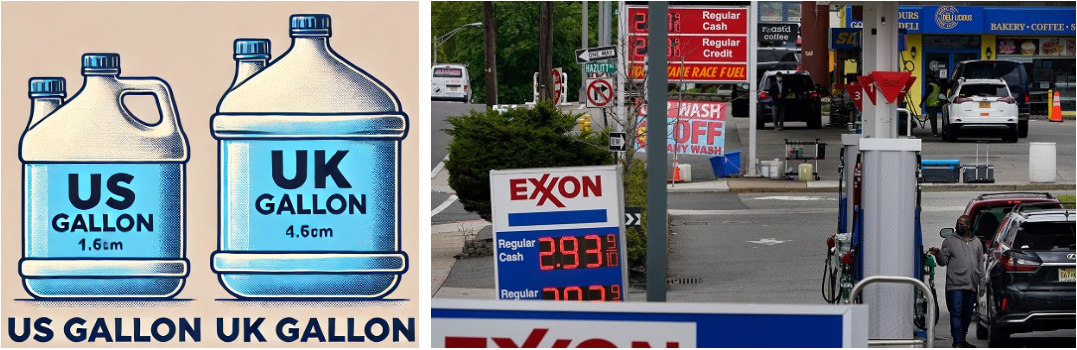♣ 미국 갤런(US gallon): 3.785리터에 해당하며, 음료수, 연료, 물 등 다양한 액체를 측정할 때 쓰입니다. 예를 들어, 미국에서는 주유소에서 갤런당 가격을 표시하여 연료를 판매합니다. 일상생활에서도 물이나 음료수의 양을 갤런으로 표기하는 경우가 많습니다.