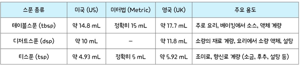 이처럼 스푼 단위는 소량의 재료를 정확하게 측정하는 데 필수적이며, 특히 베이킹에서 계량이 정확해야 하는 경우에 유용합니다. 아래는 테이블스푼, 디저트스푼, 티스푼 단위의 용도에 따라 정리한 표입니다.