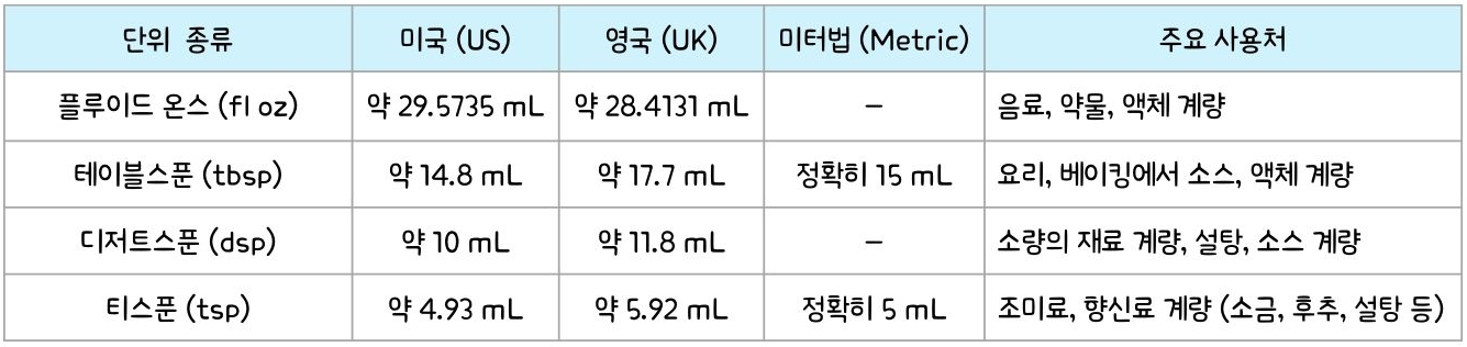 - 미터법 테이블스푼 (Metric tbsp): 정확히 15 mL로, 호주와 캐나다에서 주로 사용됩니다.