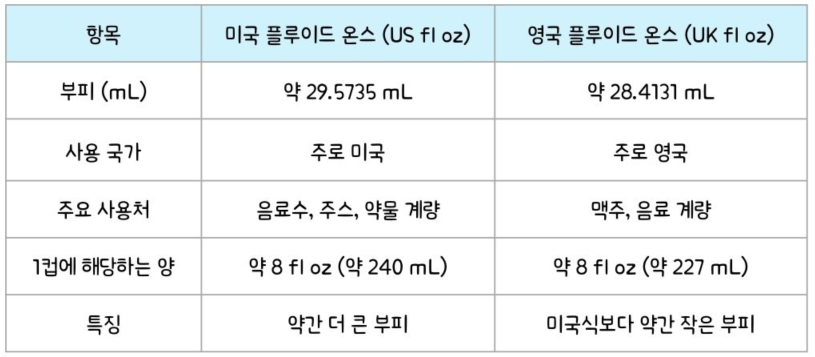 ♣ 플루이드 온스(Fluid Ounce): 액체를 계량하는 데 쓰이는 단위로, 미국 플루이드 온스와 영국 플루이드 온스의 부피 차이가 존재합니다. 미국 플루이드 온스는 약 29.5735 mL이고, 영국 플루이드 온스는 약 28.4131 mL입니다.