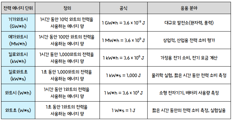 기가와트시(GW*h), 메가와트시(MW*h), 킬로와트시(kW*h), 킬로와트초(kW*s), 와트시(W*h), 와트초(W*s)는 각각 다른 전력 사용량을 설명하는 중요한 단위입니다. 각 단위는 산업, 상업, 그리고 가정에서 전력 소비를 정확하게 측정하고 관리하는 데 필수적인 역할을 합니다.