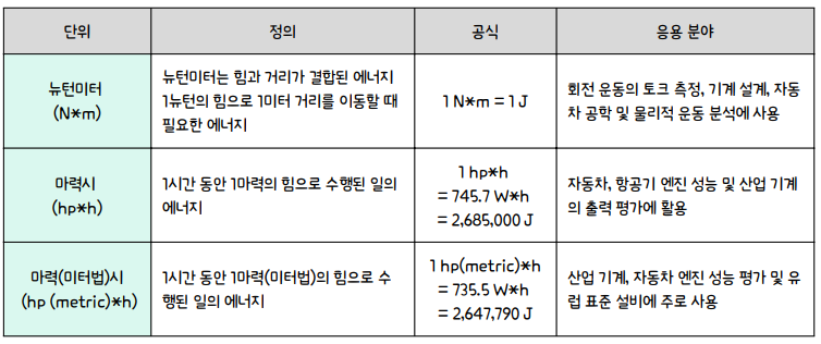 □ 정의: 1 hp*h = 2,685,000 J. 이는 1시간 동안 1마력의 힘으로 수행된 일의 에너지 양을 나타냅니다.