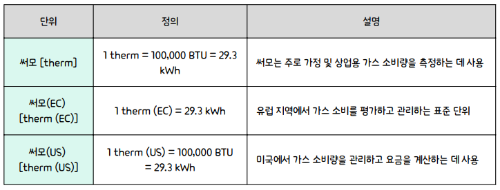 □ 응용 분야: 써모(EC)는 주로 유럽 지역에서 가스 소비를 측정하는 표준 단위로 사용됩니다. 주로 유럽 내의 가스 소비량을 평가하고, 가스 요금을 책정할 때 중요한 역할을 합니다.