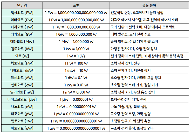 □ 응용 분야: 나노와트는 정밀 실험 장비나 나노 기술에서 주로 사용됩니다.