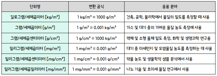 □ 공식: 1 kg/m³ = 1000 g/m³