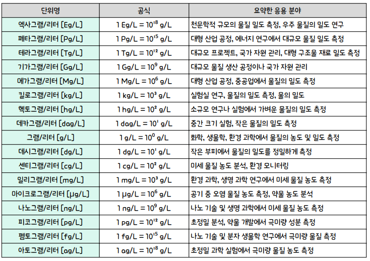 엑사그램/리터 [Eg/L], 페타그램/리터 [Pg/L], 테라그램/리터 [Tg/L], 기가그램/리터 [Gg/L], 메가그램/리터 [Mg/L], 킬로그램/리터 [kg/L], 헥토그램/리터 [hg/L], 데카그램/리터 [dag/L], 그램/리터 [g/L], 데시그램/리터 [dg/L], 센티그램/리터 [cg/L], 밀리그램/리터 [mg/L], 마이크로그램/리터 [µg/L], 나노그램/리터 [ng/L], 피코그램/리터 [pg/L], 펨토그램/리터 [fg/L], 아토그램/리터 [ag/L] 단위에 대해 알아봅니다. 각 단위의 정의, 사용 방법 및 응용 분야를 포괄적으로 설명하며, 단위 변환 계산기도 함께 제공합니다.
