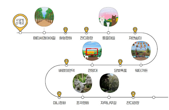 경로: 메타세쿼이아길 → 원형정원 → 잔디광장 → 동물마을 → 자연센터 → 바람의 언덕 → 전망대 → 달빛폭포 → 워터가든 → 미니정원 → 조각정원 → 자작나무길 → 잔디광장