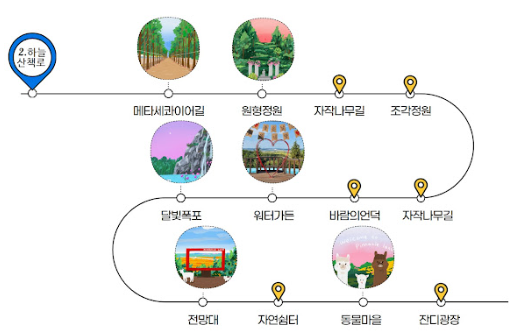 경로: 메타세쿼이아길 → 원형정원 → 자작나무길 → 조각정원 → 달빛폭포 → 워터가든 → 바람의 언덕 → 자작나무길 → 전망대 → 자연센터 → 동물마을 → 잔디광장