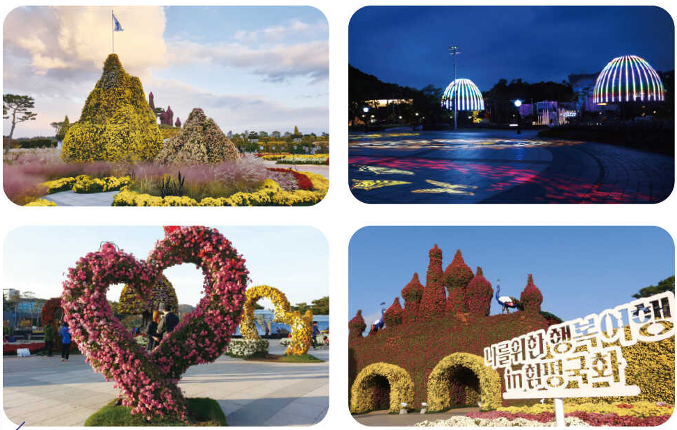 다양한 국화조형물과 함께하는 축제! 크리스마스 트리, 종소리 게이트, 9층탑, 마법의 성, 무지개 터널, 캐릭터 조형물까지, 다채로운 국화 작품들이 여러분을 기다립니다.