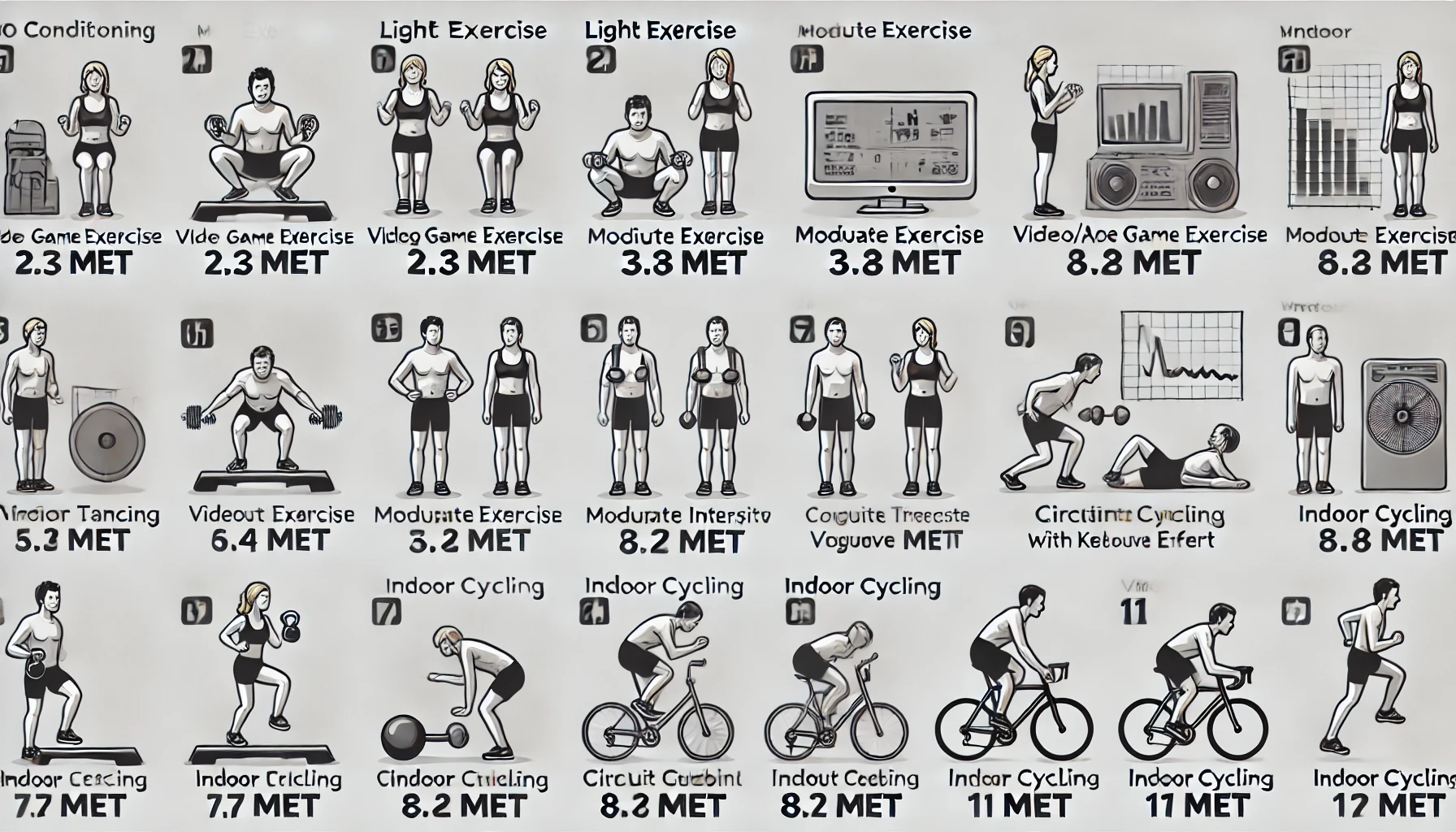 다양한 컨디셔닝 운동은 그 강도에 따라 MET 값으로 에너지 소모량을 측정할 수 있습니다. MET 값은 특정 활동이 신체에 얼마나 많은 에너지를 요구하는지를 나타냅니다. 아래는 여러 컨디셔닝 운동의 MET 값과 운동 종류입니다.