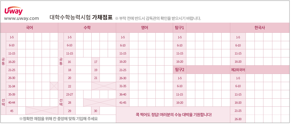 다양한 사이트에서 수능 가채점표 양식을 제공하며, 이를 통해 정확한 답안 검토와 전략 수립이 가능합니다. 예를 들어, 유웨이와 위드유에서 제공하는 양식을 사용하면 수험표 크기에 맞는 가채점표를 다운로드할 수 있습니다.