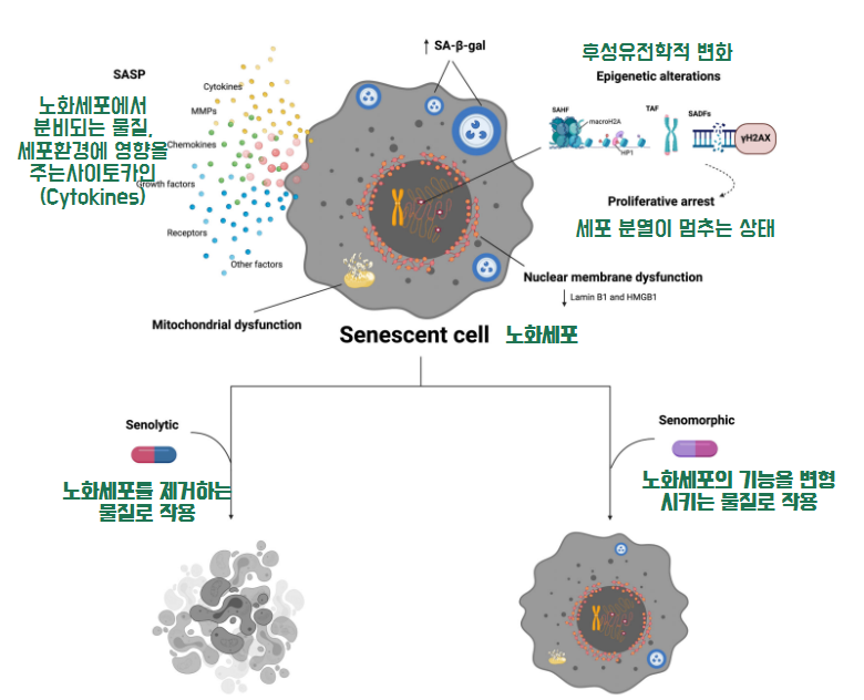 † Senomorphic: 노화세포의 기능을 변형시키는 물질로 작용.