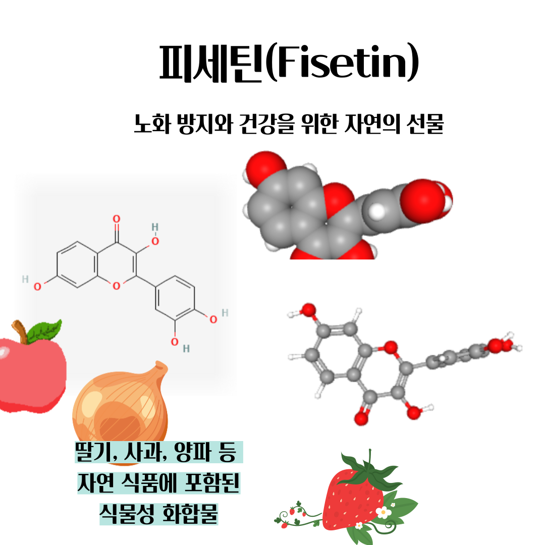- 세놀리틱 효과: 피세틴은 노화세포(Senescent Cell)를 제거함으로써 신체의 재생 능력을 도와줍니다. 이를 통해 노화로 인한 염증과 질병 위험을 낮출 수 있습니다.