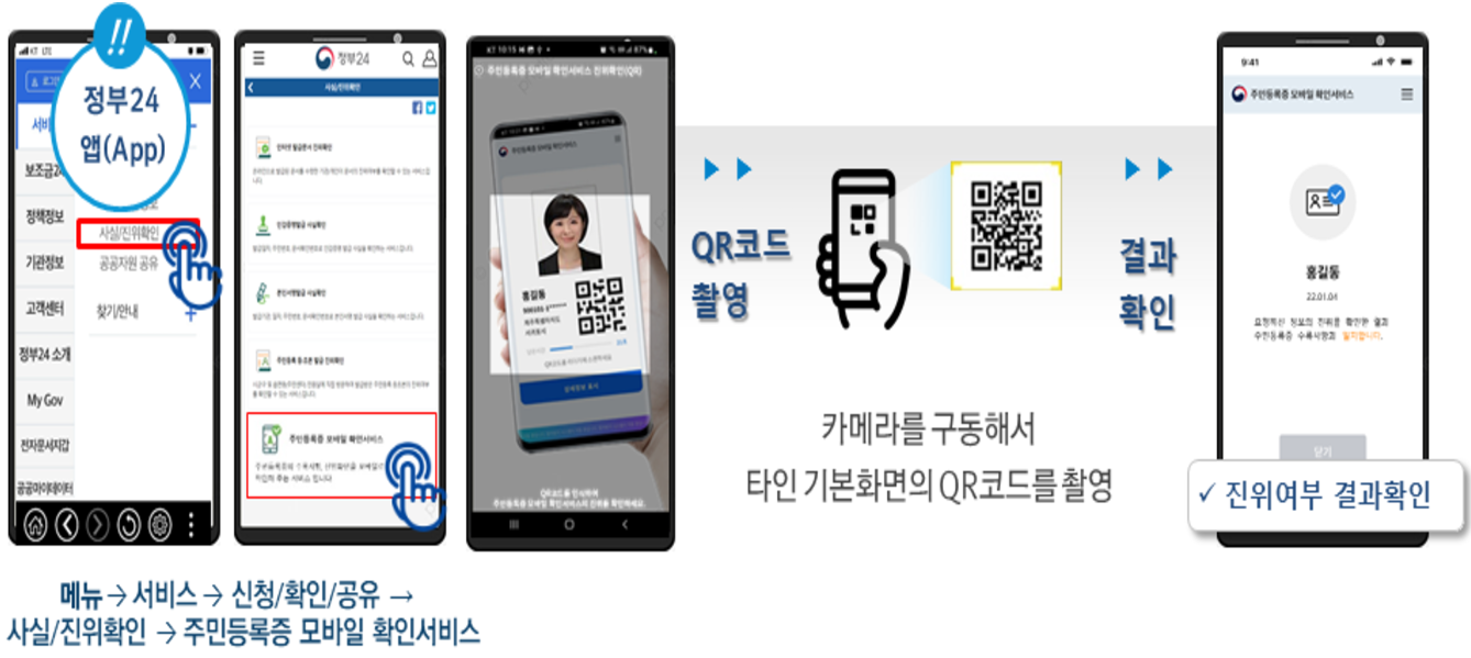 ① QR 스캔: 상대방의 주민등록증 QR 코드를 스캔하여 진위 확인.