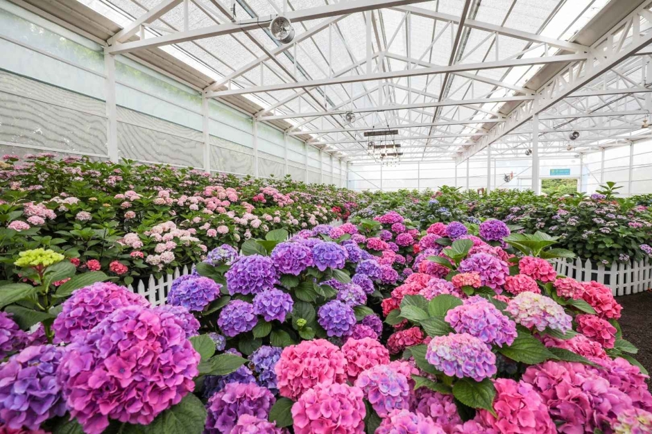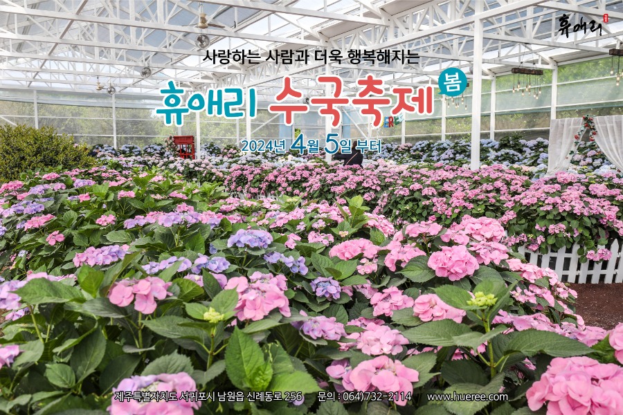 휴애리 여름 수국축제는 정성스럽게 키운 다양한 수국을 온실, 수국정원, 수국오름 등 공원 곳곳에서 감상할 수 있는 축제입니다. 공원 첫 입구부터 나오는 출구까지 전체가 수국으로 덮여 있어 방문객들에게 환상적인 경험을 제공합니다. 특히, 온실에서는 다양한 품종의 수국을 가까이서 만나볼 수 있습니다.