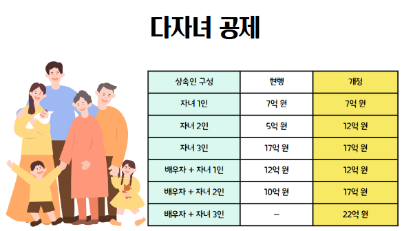 2024년 상속세 개정안에서 가장 큰 변화 중 하나는 자녀 공제의 대폭 확대입니다. 기존에는 자녀 1인당 5,000만 원만 공제되었으나, 개정안에서는 1인당 공제 금액이 5억 원으로 증가하였습니다. 이는 다자녀 가구의 상속세 부담을 획기적으로 완화하고, 가족 중심의 세제 지원을 강화하기 위한 조치입니다.
