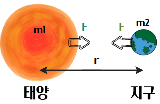 태양과 지구는 중력에 의해 서로를 당기고 있습니다. 이 힘을 계산하기 위해 뉴턴의 중력 법칙을 사용합니다.