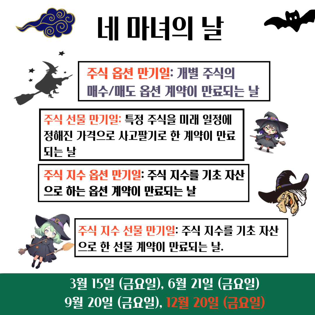 네 마녀의 날(Four Witches Day)은 주식 시장에서 매우 중요한 날 중 하나로, 주식, 옵션, 선물 등 다양한 금융 상품의 만기일이 겹치는 날을 의미합니다. 이 날은 주식 시장에서 변동성이 커질 가능성이 높아 초보 투자자와 전문가 모두 주목하는 날입니다.