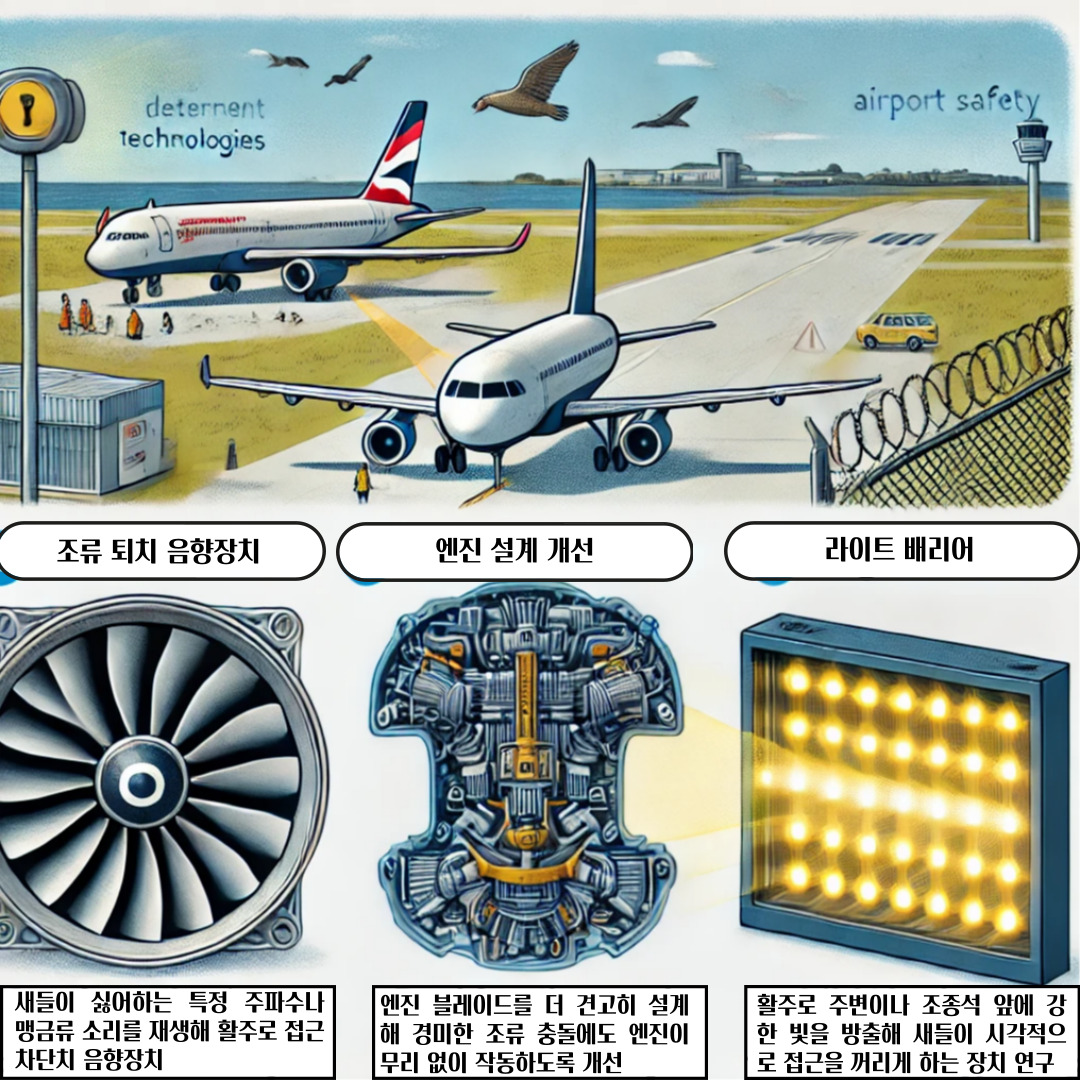 ■ 기술적 대책 역시 조류 충돌 예방에 큰 도움을 줍니다. 조류 퇴치 음향장치는 새들이 싫어하는 특정 주파수의 소리나 맹금류의 소리를 재생하여 새들이 활주로 근처에 접근하지 못하게 합니다. 또한, 항공기 엔진 설계는 점점 더 발전하여 충돌이 발생하더라도 엔진이 무리 없이 작동할 수 있도록 팬 블레이드를 강화하는 방향으로 개선되고 있습니다. 활주로 주변이나 조종석 앞쪽에 강한 빛을 방출하는 라이트 배리어(Light Barrier) 기술도 연구 중이며, 이를 통해 새들이 빛에 의해 접근을 꺼리게 만드는 방안이 검토되고 있습니다.