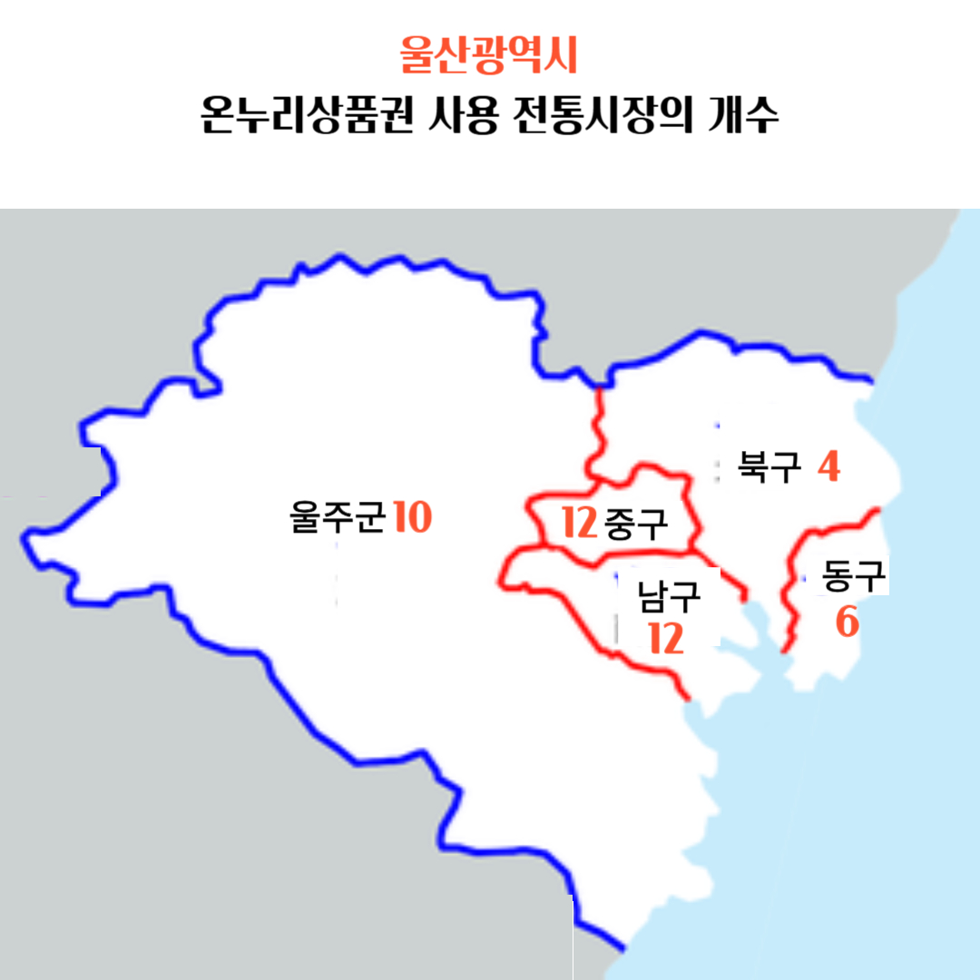 | 동구 (6) | 남목전통시장, 대송농수산물시장, 동울산종합시장, 월봉시장, 전하시장상점가, 동울산시장상점가 |