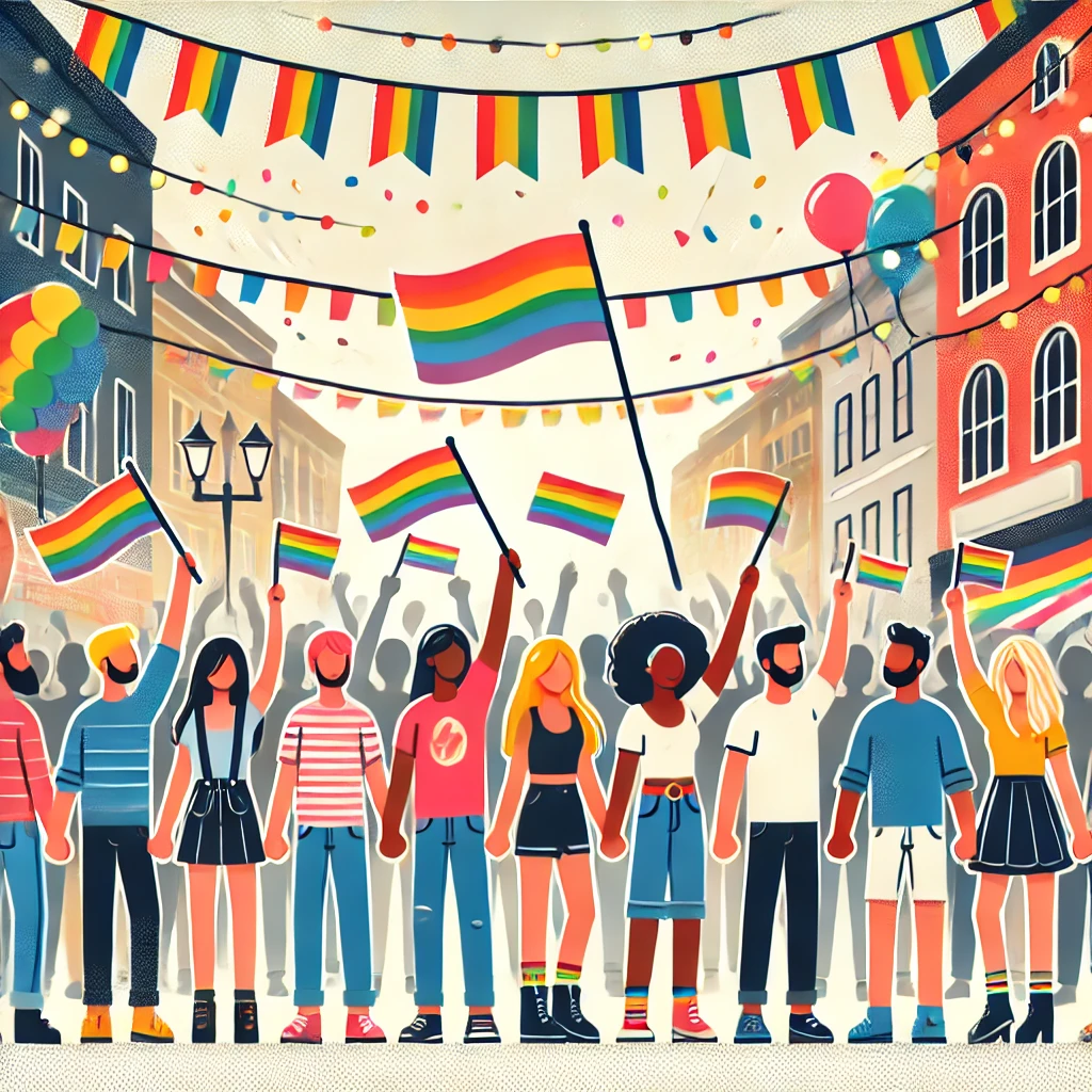 ■ 프라이드 퍼레이드 사진; 다양한 성적 지향과 성 정체성을 가진 사람들이 무지개 깃발을 들고 행진하는 장면은 LGBTQ+ 운동의 긍정적이고 포괄적인 메시지를 전달합니다.