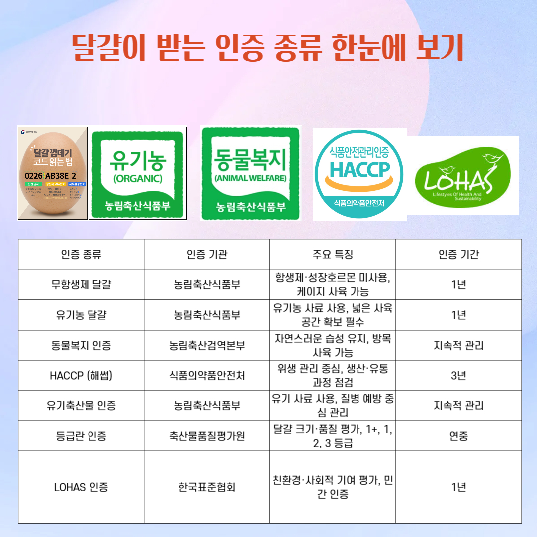 | 유기농 달걀 | 농림축산식품부 | 유기농 사료 사용, 넓은 사육 공간 확보 필수 | 1년 |