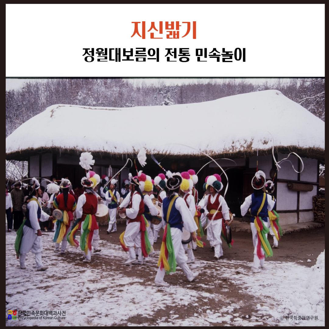 지신밟기는 정월 초부터 대보름까지 마을을 돌며 지신을 진압하고 액운을 막는 전통 민속놀이입니다. 풍물을 앞세운 놀이패가 마당, 장독대, 우물, 조왕(부엌) 등을 밟으며 지신풀이 창을 부르고 춤과 익살을 선보입니다. 주민들은 쌀과 촛불로 고사를 지내고, 음식과 돈을 대접하며 마을의 공동경비로 사용했습니다. 농사의 풍년과 가정의 안녕을 기원하는 신앙적 행사로, 현재는 주로 영남지방에 남아 있습니다.