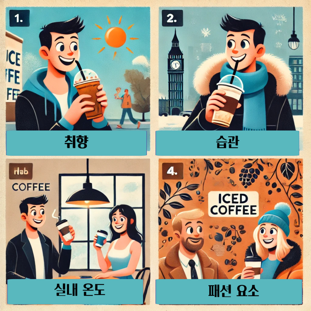- 습관: 사계절 내내 아이스커피를 마시는 것이 습관이 된 경우가 많습니다.